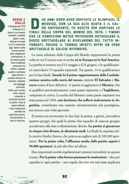 Pensato per veri appassionati di calcio, ma anche per chi vuole conoscere la magia e la passione di uno sport che, non solo ogni quattro anni, unisce il mondo, facendo sentire tutti i tifosi del pianeta dei fratelli. Non solo un'opera di consultazione, ma un vero e proprio tesoro da sfogliare e vivere, perfetto sia per veri tifosi che per gli amanti delle grandi storie, umane e sportive.