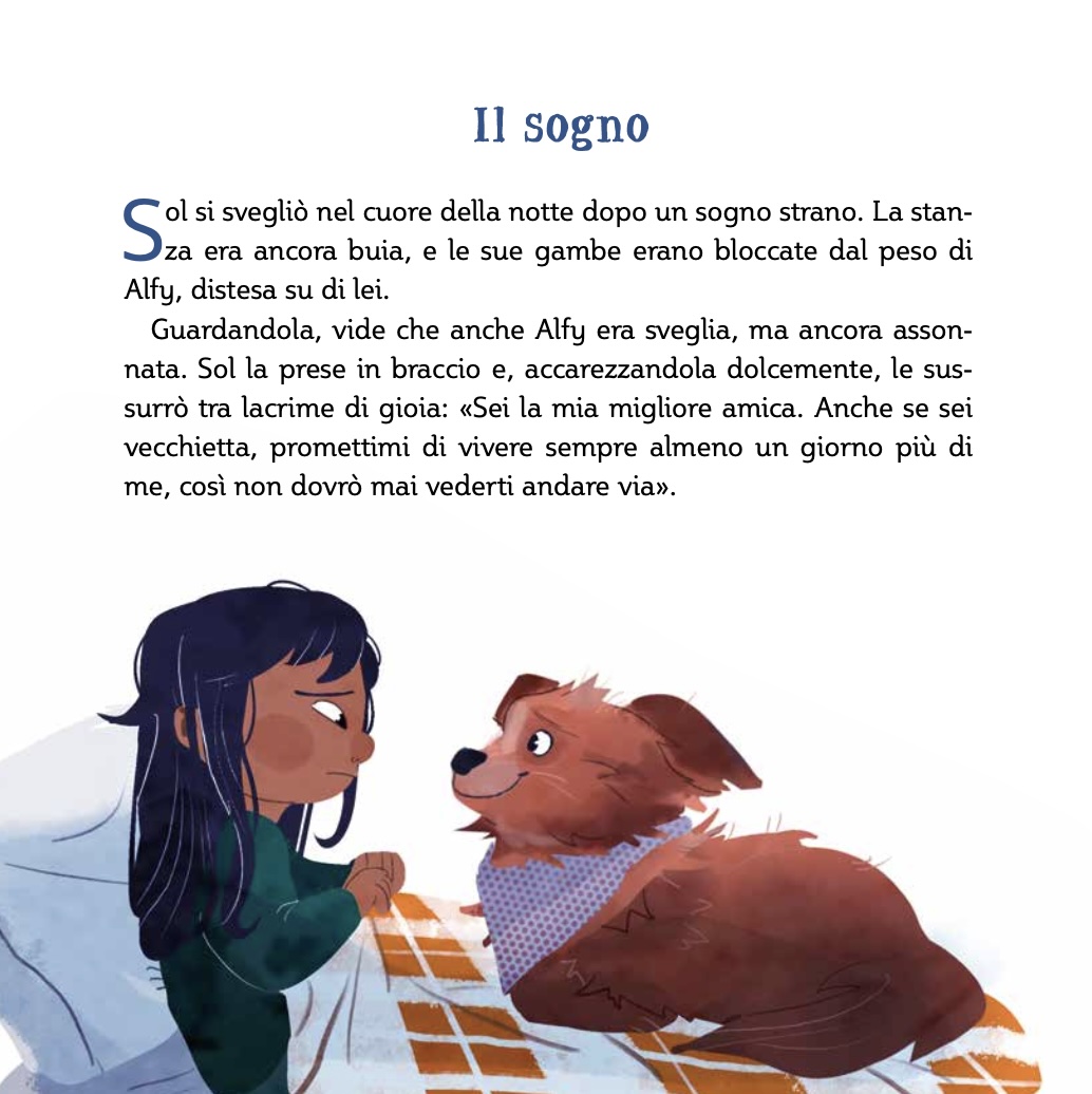Un racconto illustrato, tenero e profondo, che esplora il potere trasformativo dell’accoglienza e dell’amore attraverso gli occhi di una cagnolina anziana. La voce narrante è quella di Alfy, dolce e buffa, a tratti malinconica, capace di far sorridere e commuovere. Trovata per strada e salvata da un destino crudele, Alfy entra nella vita di Sol, una bambina intraprendente e affettuosa, con cui instaura un legame unico. Insieme, scopriranno la forza della fiducia, la gioia dell’amicizia e il dolore della perdita, affrontando ogni emozione con dolcezza e coraggio. Il libro intreccia momenti quotidiani a suggestioni più ampie, tra riflessioni sul tempo che passa e tocchi di cultura peruviana, offrendo ai lettori di tutte le età una lettura ricca di significati. A impreziosire la narrazione, le magnifiche illustrazioni a colori di Blu Pieraccioli, capaci di dare vita ai personaggi con grazia e vivacità, e di rendere ogni pagina un piccolo quadro da scoprire. Una storia che parla al cuore, perfetta per chi ama gli animali, le storie familiari e i racconti capaci di abbracciare anche i temi più delicati con semplicità e calore.